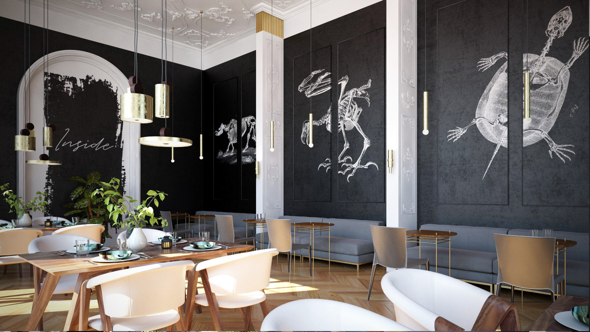 Interior design concept of a restaurant, called Inside. Mixing baroque elements and street art is so exciting. Black, white, red and brass shape the room.